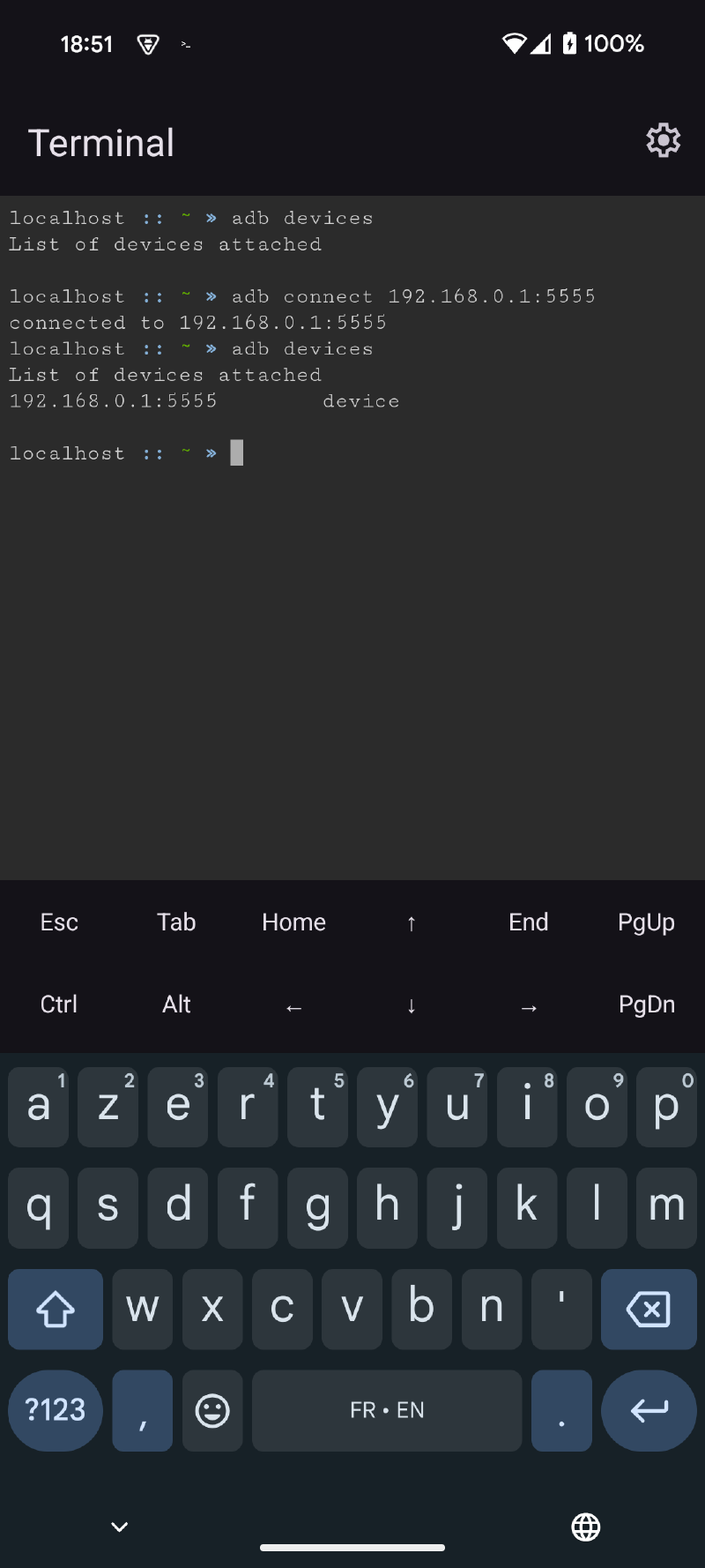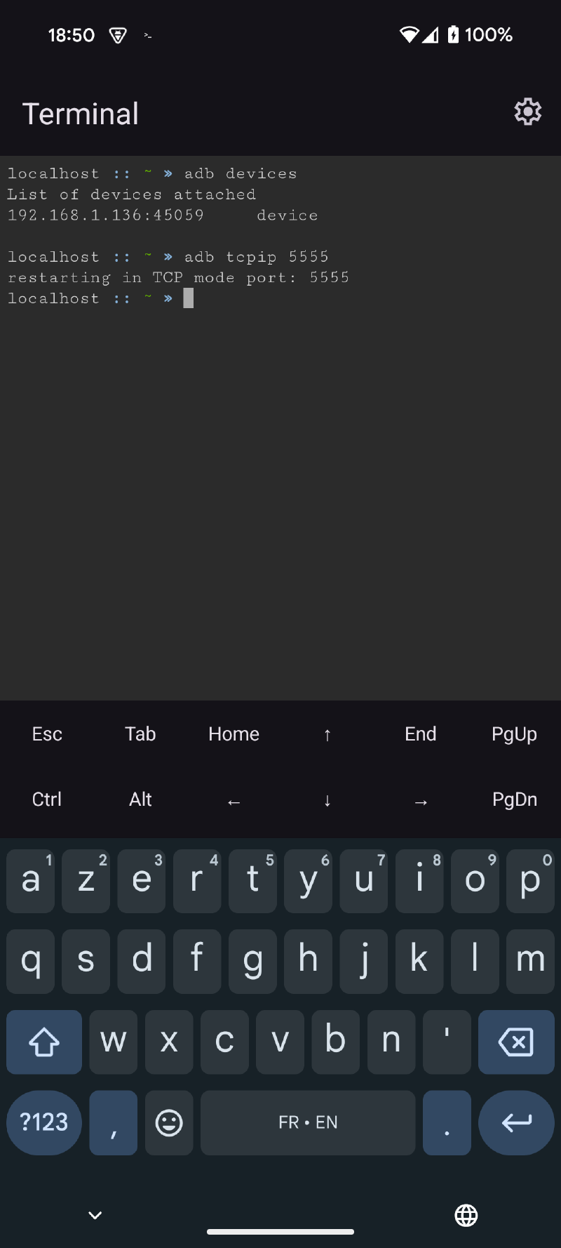 adb reverse tcp:5000 tcp:22Ainsi le server SSH est accessible via le port 5000 depuis un appareil sur le même réseau que le téléphone.