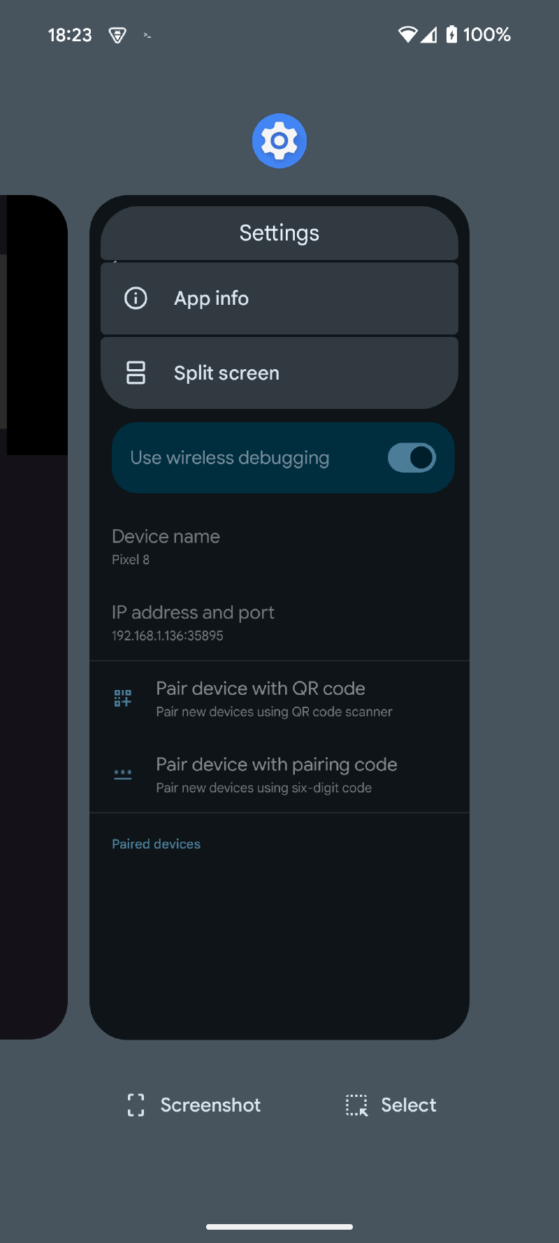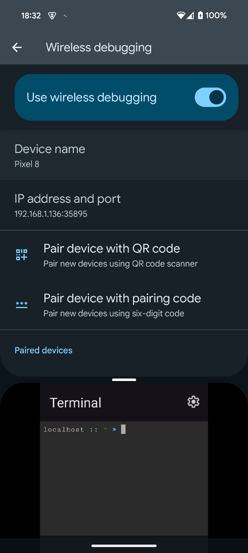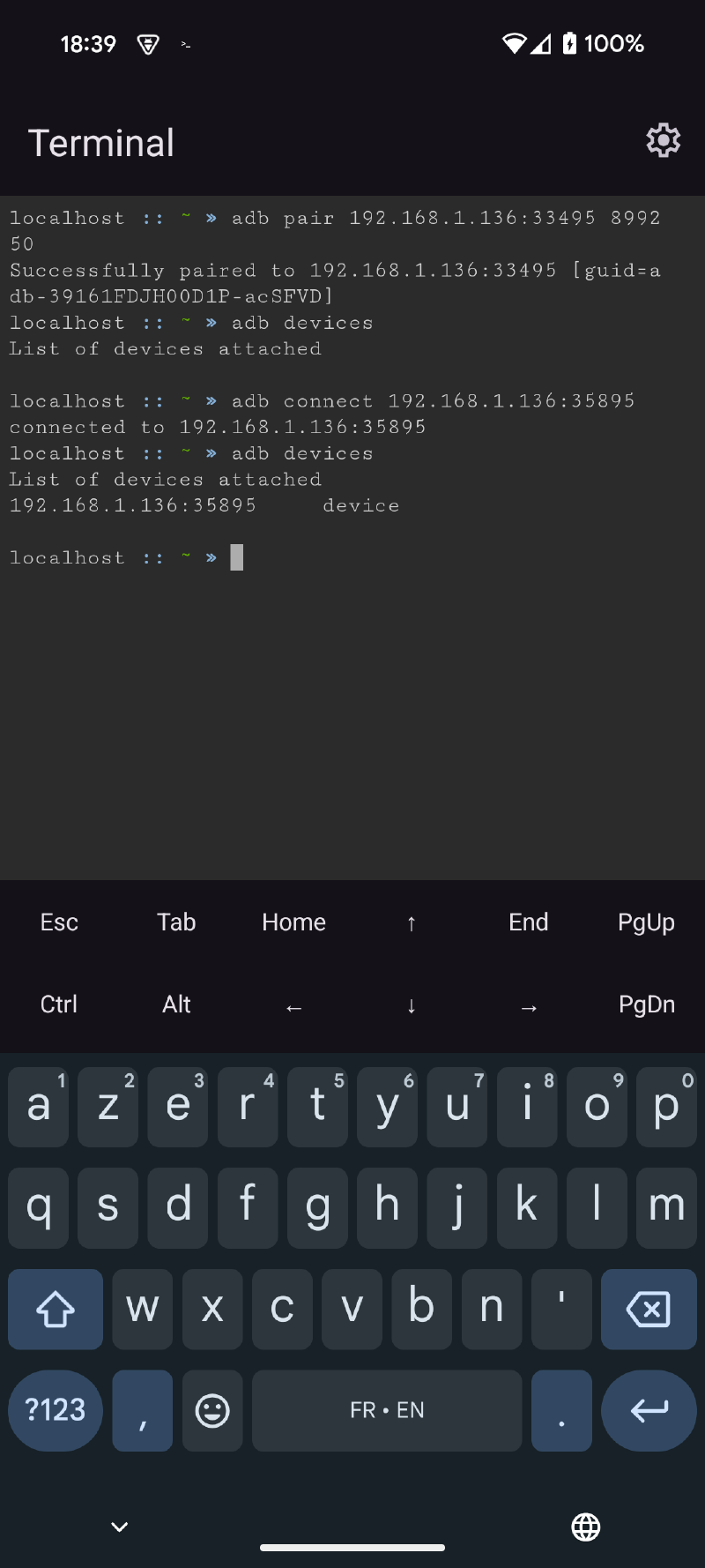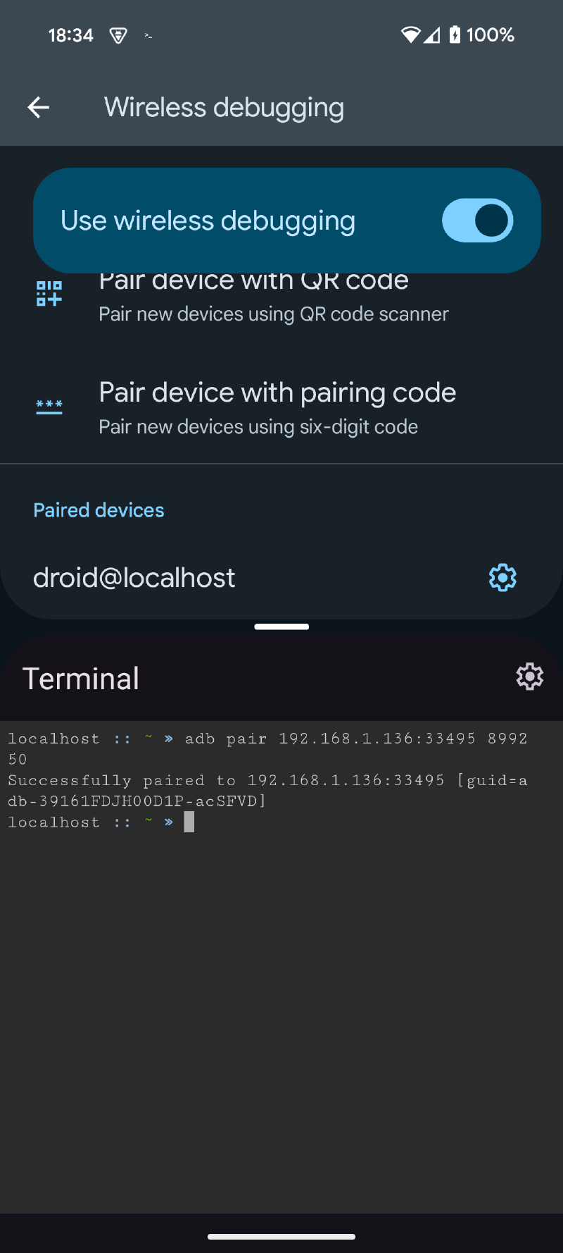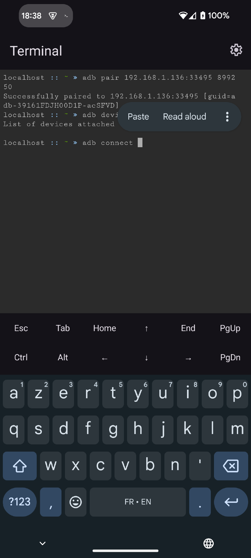 ᐅ Une fois appairé, se connecter avec adb connect et les informations données par l’application Settings. La fonction copy paste est utile ici